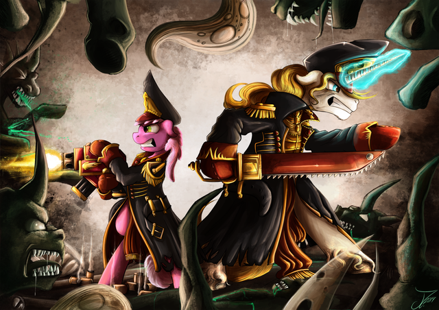 I think I did pretty damn well on this cross over, and I hope it is loved by many! As I very much like this pic a lot. Kinda scary too >-> The idea of pinkie having a power klaw, and twin-linked shoota with a chain sword attachment is pretty terrifying, and judging by the city behind her, i'm sure they can agree.