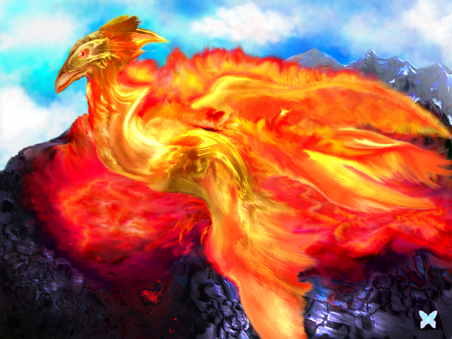 I really love the fire around the phoenix. It's really beautifully done and looks real. Plus it provides illumination around it so we can feel that he is being reborn. I also like how you've kept the surroundings relatively dark, so that it stands out better!