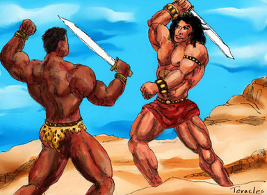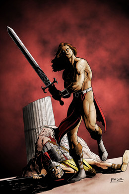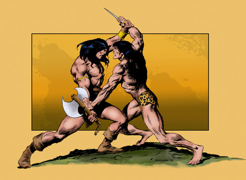 Conan fighting another one of those Stygian dogsTried to do some unreferenced dynamic figures. I'm happy with the Stygian. Conan came out rather a lot like the "rockfall" Conan, but could have been a little more dynamic.