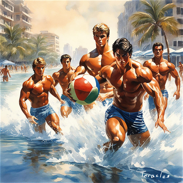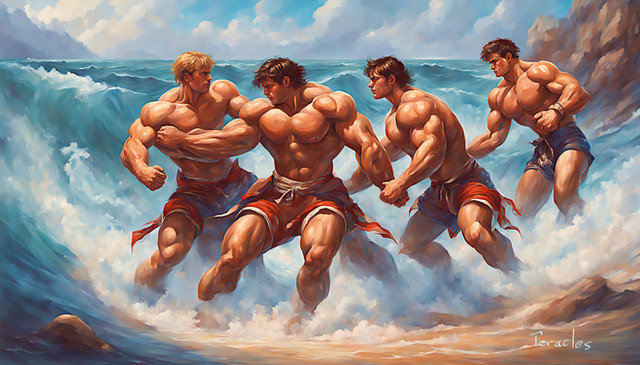 Posedown at the Mega Men Contest. I did this for nzbodybuilder [link] , who wanted to see himself on stage. Oh, and he wanted to be double the size of the rest of the guys. Hope you like the scene, big guy12x18", watercolour