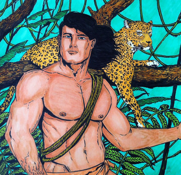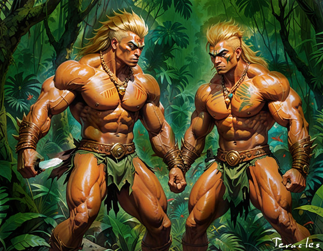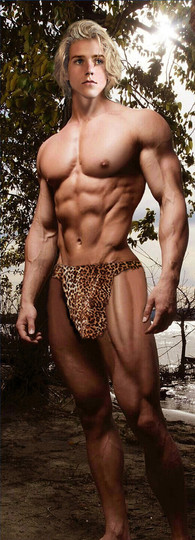 More of the muscle and comics theme, with two beefy blonds dressed up as leopard tribe warriors, from my Korak comic series.Related content