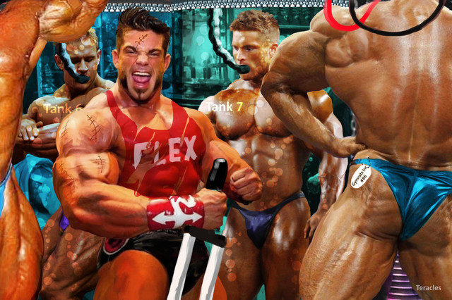 Back at the lab, they're making progress, and gymrat #22 just weighed in at 375 pounds. There are a few side effects, but no one expected it to be easy."Igor, WHERE did he get that bone?" asks Dr. Frankenmorpher. "Never mind, just get him locked up before moonrise ..."