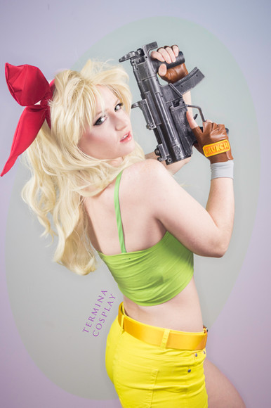 Android 18 was a cosplay made with mostly purchased/altered items. I spliced two shirts together to make the shirt, I appliquéd the Red Ribbon symbol on the back of the vest, I added the straps to the boots, and I painted the belt buckle and added it to the belt. It was just a quick easy costume that is super fun to wear!