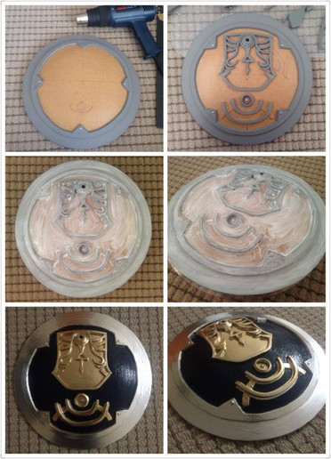 14-15. Next you will paint on the details. I'm using gold for mine. While you can just buy metallic gold paint in a tube (which I did) I feel like the metallic shine in these isn't quite good enough by itself, but you can fix that by adding in metallic pigment. Metallic paint in a tube is also very thin and requires a ridiculous number of coats to cover something, and adding in the pigment helps with that too. I made my gold by mixing my gold and copper paints and adding in the brilliant gold and super bronze pigments. You don't need to use bronze, but I like my gold to be a little darker. Treat this color just as you treated your first color. Cover with a few base coats, then add highlights and shadows. If your prop needs multiple colors for details, repeat these steps for each one.