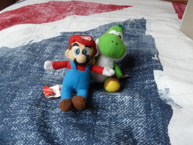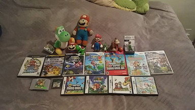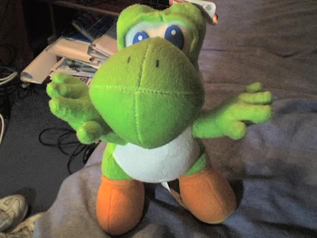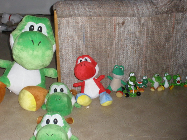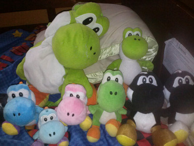 Nice collection I have one of those plushys sept verry beat up and old (like 8 years) the GBA game, N64 a Yoshi story poster and a Yoshi Kart toy too but it's a push back kind.