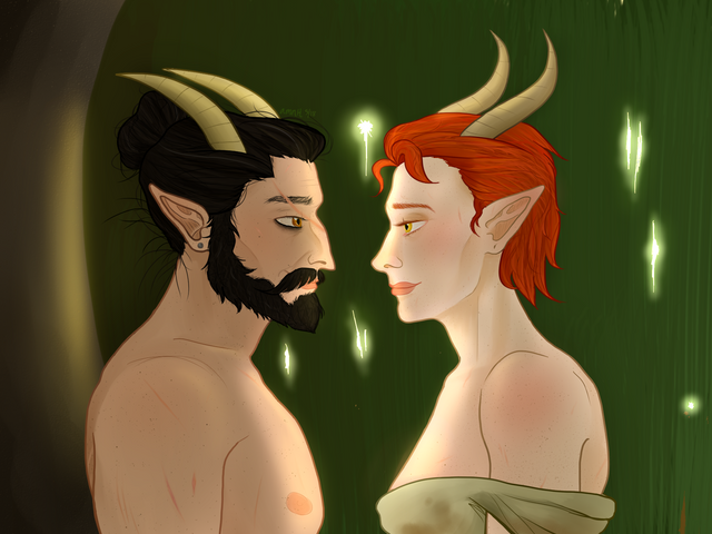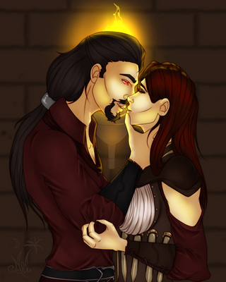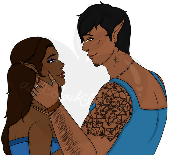 Here it is, OC Kiss Week 2017 has come to an end. The final prompt, "Goodbye". Here we have Anaan Adaar & Jarod Aeducan. Now, Anaan is short for her race and Jarod is tall for his but that's no excuse, the height difference here is way off. I imagine he's either on his knees on the bed (tall bed) or he's standing on it. Either way, he's up on something to be at this height with her.I imagine this is an AU where Jarod didn't get with Morrigan... and he instead found himself this li'l beauty.