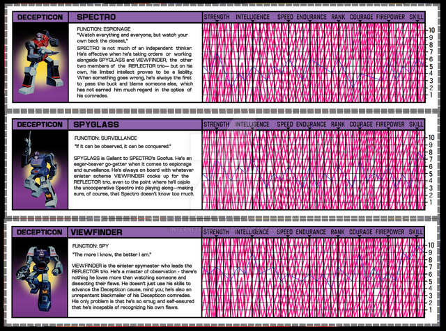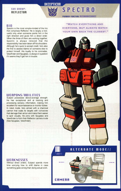 Featured in the Trannis and Soundwave/Shockwave chapters, the Reflectors play a key role in the ending battle of the Magnus chapter, delivering a lethal blow to on of the key members of Cybertronian Government.