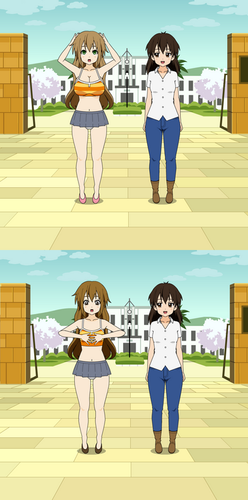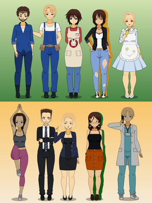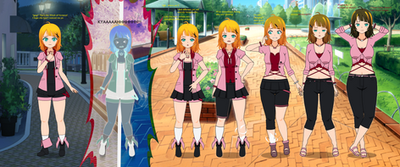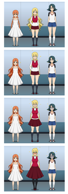 Aeron and Pearl: Aeron has a lovely brown dress now, and a small jewel you can see in one of Pearl's exports; Pearl's shirt and skirt are now a dress and she has a belt, and her formal outfit gives her blue lipstick