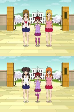 Y2K and Ji-woo: Yolanda's shorts are different, her stockings and sneakers are darker in color, and she now has clips to hold her ponpons; Ji-woo didn't change much