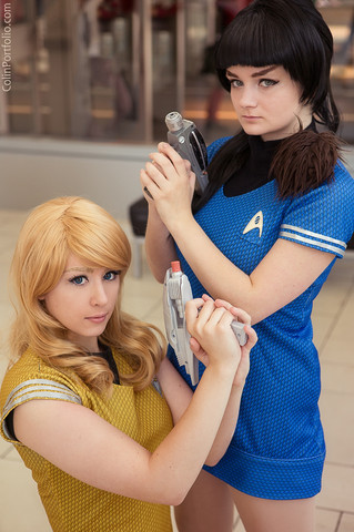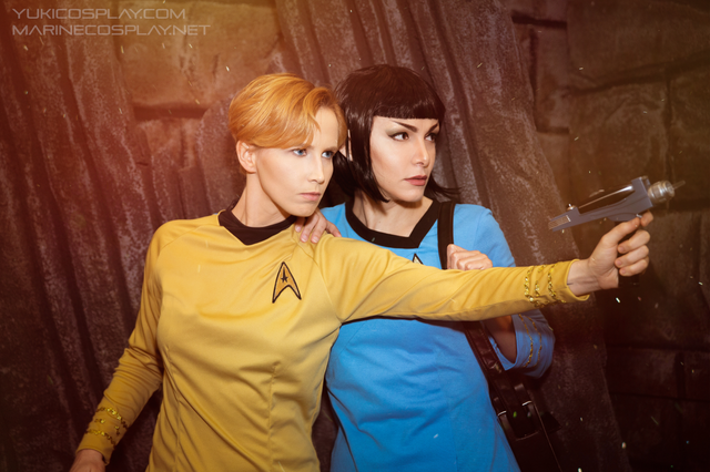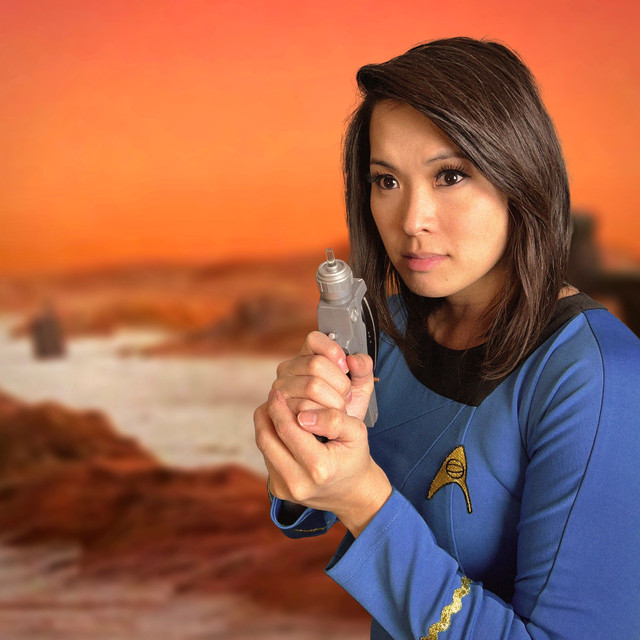 She's cosplaying a starfleet officer from the alternate Star Trek universe.