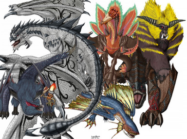 these are all the rathalos and rathians from the monster hunter series that have come out yet. the background is a wallpaper of the forest and hills (one of the rath's favorite location). all of the renders in this piece of art are subject to its respectful owners.Related content