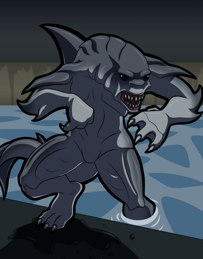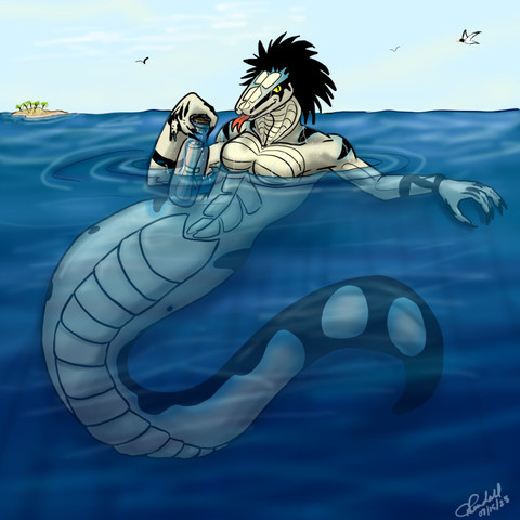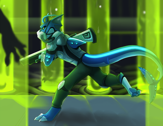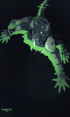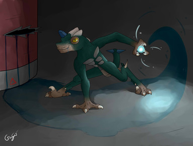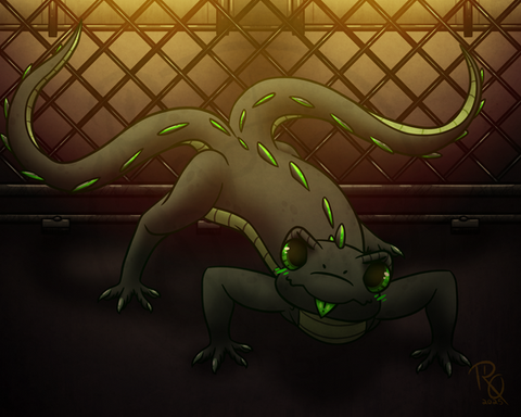Playing with giant vats of biohazardous chemicals can be hazardous to your health.Not sure if I'm 100% happy with the highlights, they're a little inconsistent. Bleh. Other than that, I really like this. The sides of his waist in particular, very salamaderish. Although, you can't really see that well with the big tube in the way. Maybe later on I'll throw up the version without the tube. :/