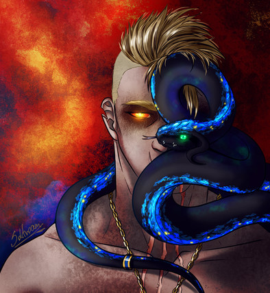 #animal #background #beast #big #black #blue #character #contrast #digital #fantasy #flames #giant #head #headshot #human #humanoid #hybrid #illustration #lizard #male #mask #monster #oc #original #portrait #python #red #reptile #reptilian #snake