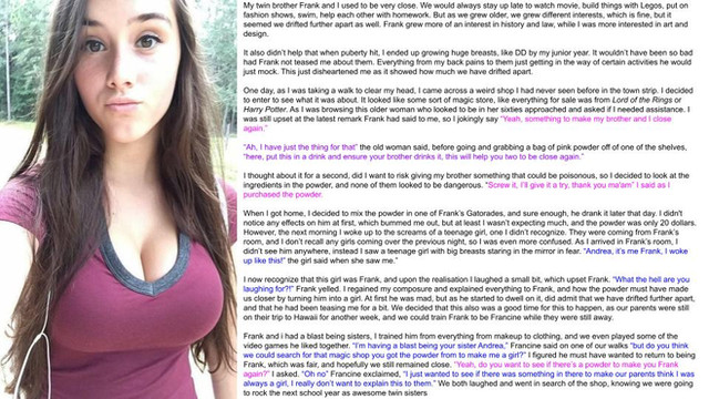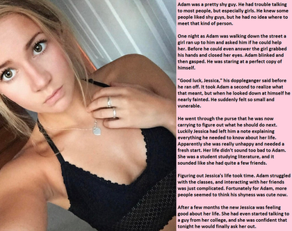 “This is soooo weird…” I said aloud, moving my hands to my slow-growing breasts. Anthony’s tight pants began to show off his appendage as it hardened. “This is so awkward!” So weird! So awkward!” My arms became slender and hairless, while my thighs became thick and smooth. My hair dropped down in front of my face, obstructing my vision a bit. My shirt became skin tight, showing off all the right curves. My mind became cloudy for just a bit, and I started to black out. As quickly as the feeling came, it went away. When I opened my eyes, I looked at Anthony. He was completely transformed. He was super fucking cute. I loved how caring he was, how he picked up on the small details about people, and how sensitive he was. He was everything I’ve ever wanted, but it was then that I realized he hadn’t changed a bit. I smiled at him.
