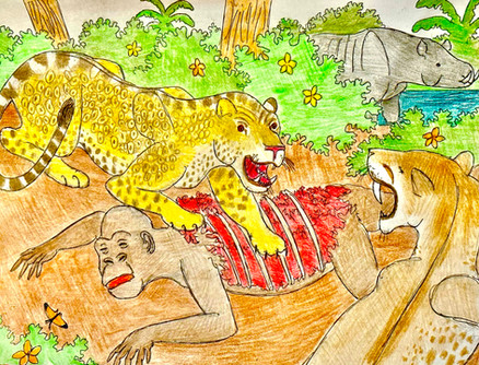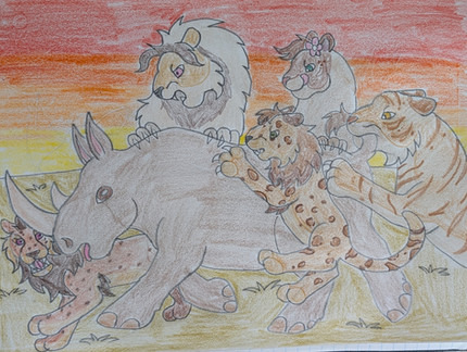 "Gotcha!" said Ryan, the zebra strugled to break free as Ryan grabbed the biggest boulder he could lift, and and struck the zebra`s head with it. She collapsed unconcious,but still alive. It was time to make his kill, with child-like exitment Ryan slamed the boulder into the head of it's prey again and again, before he finally realized that his quarry was dead. Ryan started laughing and clapping before he made a triumphant roar which got enhanced in volume by the cave walls scaring the zebras and wildebeest cowering outside thinking that a much bigger and fiercer big cat was inside. A few hours later the vultures arrived carrrying the fire wood. The herd was still outside the cavern too scared to enter it, which gave them an idea where Ryan was. They soon found the zebra, who was missing a huge chunk out of her belly, and close to her was Ryan, his mouth and chest soaked in blood, sleeping peacefully. " I have a hunch that he won't mind if we take our share!" said one vulture to his buddies as started a feeding freenzy while Ryan continued sleeping like a stone.