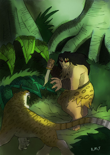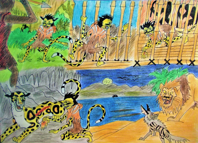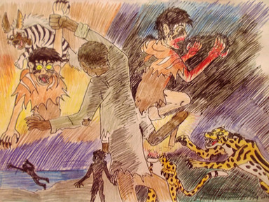 Ryan ran and pulled his machete out of the tree trunk and faced his enemy with both blades. After clutching his wounded eye for a moment Raja regained his composer and slowly walked towards Ryan who now got a good view of the lions empty and blood dripping eye socket. They stared each other for a while, until unexpectedly Raja burst out laughing, his dark and disturbed laughter creeped Ryan out as he yelled "What`s so funny!" the lion looked at him and spoke in a disturbinglly casual way " Alright, you proved yourself to be a strong opponent, I`m impressed. I realized now that I have nothing to gain by maiming myself further in this fight, so I`ll let you go this time", Ryan was dumbfounded by the lions reaction before sneering " Yeah right, you just want to save your sorry ass from being killed!" Raja remained calm and smiled " Call it whatever you please, but remember that you haven't seen the last of me. You won this fight, but the battle is anything but over!" and with that the lion ran of into the forest, leaving Ryan alone and confused on wheater he should feel triumphant or not. He meet up with the gorillas back in the cave to learn that they chased out two lionesses but the rest of them were certainly dead, when suddenly he heard a familiar voice screaming.