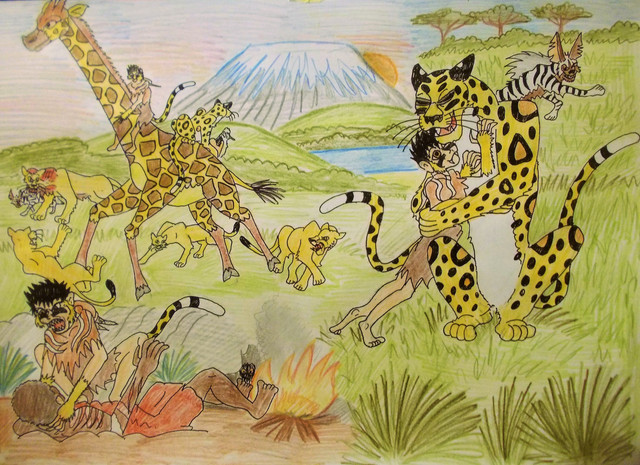 It was way past noon when he finally woke up, the overfeed vultures were lounging around until they flew up in fright upon seeing him, however he was only mildly annoyed when he asked them why they were overeacting, much to the birds relief signaling that he was back to normal. Ryan quickly noticed that he was in the nude again " Ah crap. Not again" he sighned before noticing the stripped apart carcass and the memories started flooding back. " I took down a full grown zebra!" he remembered feeling proud of himself " This should show Cameron.... CAMERON!" he suddenly remembered clutching his hair (or head fur), she was still held captive and he wasted nearly an entire day chasing a zebra, he really was weak and let his instincts control him. As he kneeled down in despair one of the vultures came to him saying that he has to see what's on the other side of the cavern. Quickly making a new loincloth from the zebra skin and carrying the broken spear with him, he followed the last of the zebra and wildebeest crossing the underground path, Ryan came out at the other side of the mountain range and was astonished at what he saw.