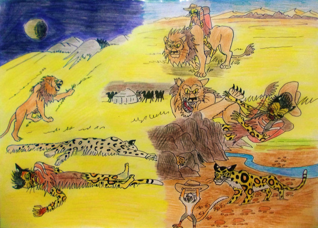 Raja laughed to himself as he saw her attacking the zebra limb as if it was still alive and bite out and gulp down huge chunks of meat like a raving glutton. But his cheerful mood was short lived as he noticed that Ryan still hadn't returned. The lion was growing suspitious, and sent Razoul on a mission to track down the boy and see what he's up to. Razoul obeyed as usual, but found that his target was nowhere near in close proximity, his trail made a bee line towards that mountain range, was he meeting the shaman there though Razoul?