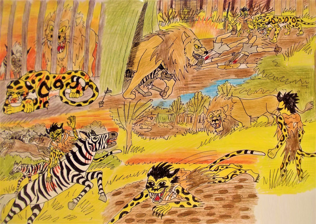 Within a dry forest there was what used to be a human camp. Now 2 largely consumed human corpses lay by the long extinguished fire along with several partially eaten zebras, all of which feed the lion pride which was temporarily recuperating there. It was early morning, most of the pride was asleep , but not their prisinor Cameron who roamed trough her prison, being caged wasn't the only factor that drove her over the edge, her hunger was now more agonizing than ever, she felt like her body was eating itself from the inside. She lay down in an almost fetal-like position, her combined anger, phisical pain, fear and agonizing hunger put her in an enourmeous mentally asphyxiating ordeal. Then she noticed Raja watching her. He threw a zebra hindquarter trough the bars and told her that this was her breakfest. Getting up she glared daggers at him " You did something to it didn't you! You found some poison from the humans and pored it over it! You're not fooling me!" Raja chuckled at her angry accusation " Of course not. I`m mearly being a good host, I don't want you deteriorating before your execution." he said as he left. Cameron would not let herself be feed by him out of pitty, she was better than that, she wanted to throw it out, but couldn't as she was watering in the mouth and every instinct in her mind was forcing her into doing it.