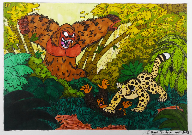 He was left wondering the forest alone, lost in his thoughts, if he wanted to take out an entire pride of lions he would need to set up a pretty grand and elaborate trap. His thoughts were interupted as he heard hooting and crashing in the vegetation, soon numerous gorillas appered some carrrying of their babies others pounding their chest doing their threat display. "Oh great I walked into a gorilla colony during feeding time" Ryan tried to back out of the area before he heard a loud roar as a towering silverback came crashing trough the bamboo stalks. Ryan dodged his massive fist and tried to run, but the silverback grabbed him by the tail and pulled him back, as the roaring gorilla raised his other fist to slam into him Ryan striked him across the face with his shaft. As he was let go Ryan tried to escape but had every exit blocked of by angry gorillas, as the silverback charged at him Ryan slipped beneath his legs and ran. He climbed up the nearest tree he could find, it wasn't a particularly big one and the silverback grabbed it's thin trunk and started shaking it. " Look I wasn't attacking your tribe, can't we talk this over" Ryan begged only to be suprised when the ape actually calmed down " A leopard trying to use diplomacy?" the silverback sneered " Never thought I'd see that" " But I`m being honest sir. As you can see I`m just a cub do you honestly think I would attack an animal as powerful as a gorilla. Even grown leopards don't do that" Seeing that the silverback was starting to believe him as he let go of the tree, Ryan cautiously climbed down ready to get out of here, but then the silverback growled demanding to know why he entered their territory " I didn`t know where I was going, I was lost in my thoughts, trying to evade some lions, and so...." Ryan tried to leave but was grabbed by the arm " What lions? There are no lions around here!" said the silverback towering over him, Ryan noticed the fear behind his stern tone. Ryan explained that a large pride was heading this way which got the whole tribe worrying. It wasn't hard to deduce why, with a huge pride of bloodthirsty lions around here life would be a lot more dangerous for them. Seeing an oportunity here Ryan told the silverback that he could help them deter the lions if they would be willing to trust him.