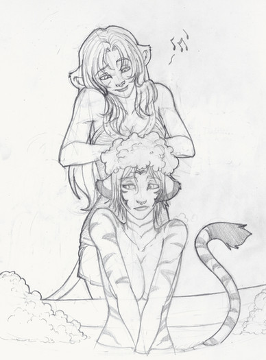 Whoot! It's finally done! the colored version of the sketch! Again, this is Tomoko pampering Gabbie, better known as Gabriel in his male form. He doesn't look too happy...I don't think he likes the pink froth all that much!First drawing entirely inked using Photoshop's pen tool (except the eyes, noses and mouths)!