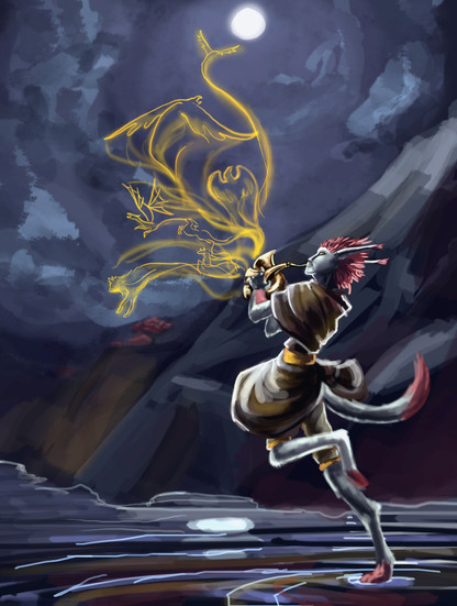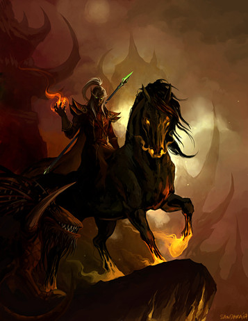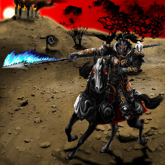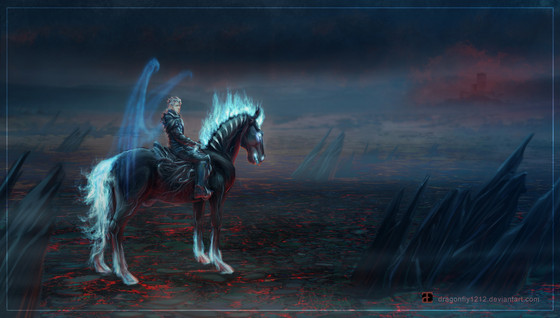 och..Fehler sehe ich da jetzt keine ^^ Besonders gefällt mir die Idee, dass das weiße Pferd auf seinen Hufen eine kalte blaue Aura oder ähnliches hat x) Meine Version hat nebelartige Dunste, die er jedes Mal beim aufschlagen der Hufe macht, erzeugt wodurch er etwas geisterhafter erscheint, aber das mit de Blau mag ich total und harmoniert wirklich super mit dem warmen Hintergrund x)