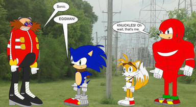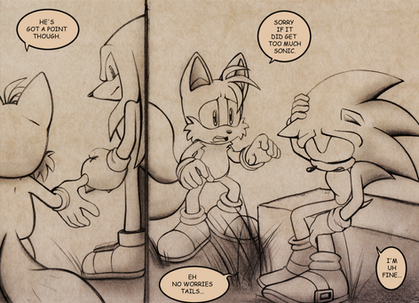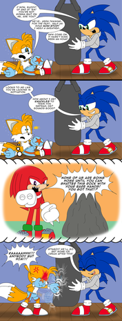 But after Sonic got kicked out, he was pretty mad about it and wanted to show Tails the consequences on what happens when he kicks out his good pal... So he asked Knuckles to come along, and both stepped inside the workshop. Once Tails showed up, Knuckles grabbed him and brought Tails to the tool cabinets where all his measuring instruments were organised...with Sonic standing next to it...and started to throw, stomp and bending various measuring instruments...which made Tails go berserk...don't think it's going to end well!