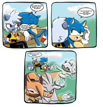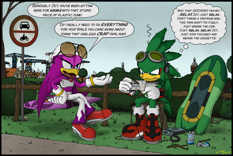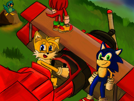 Jet and Sonic trying to fix the Tornado of Tails after Jet crashed into it by accident while racing with Sonic. Jet decided to try and repair the damage he made, Sonic joined too. They relocated the plane behind the workshop of Tails to hide it from view while they are working on it.