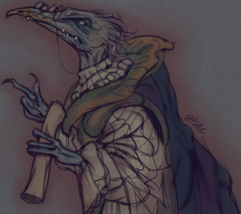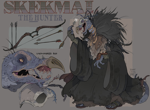sooo,,,, the skekSa pic I did a while back really took off and it's long since been my most popular submission, though I've wanted to revamp it for a while considering my hcs of the character (whomst i love <3) have changed quite a bit since then. So here she is now! I based her look a lot more off of one of Godbey's illustrations from tides with a few liberties from my old picand a few added head shots from tumblr cuz why not. the world needs more burly avian women in it anyway