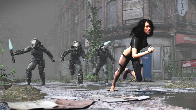 Posing in DAZ Studio. Materials, lighting and rendering in Vue 9 Infinite. The motion blur was done in Vue using 12 passes of Hybrid 2.5D blur.