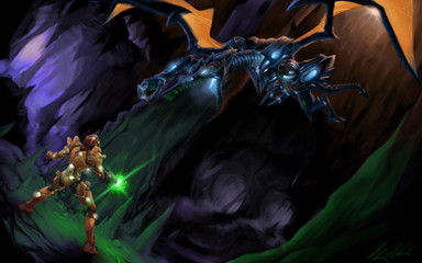 An art contest has recently been held by an upcoming comic fair... the theme was "Versus" as in duels or epic arivalries among fictional characters. I choose the most badass bounty-hunter in the Nintendo library and her monstrous nemesis as subjects for it, since this is year is also Metroid's 30th anniversary.This pic costed me several hours of work: both characters have been first hand-drawn with pencil and paper, then inkend and colored digitally in Photoshop. The background is also done from scratch... in the past I had the bad habit of relying on stock photos or textures, but this picture is 100% my doing, and I'm rather proud of it, if I can pat my own shoulder.