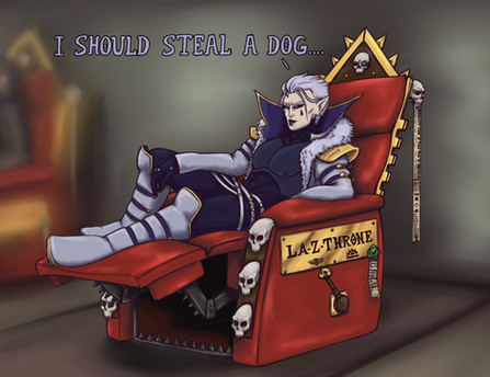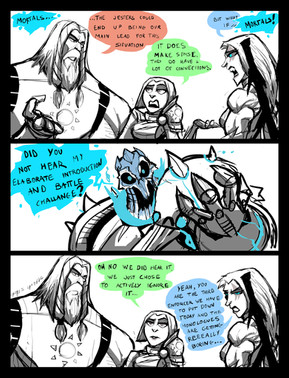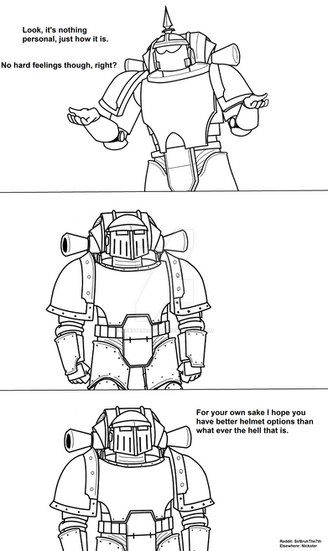 Mucking about with style practice after seeing a funny comic, transposed a couple Rotgrind characters with the idea that Baldric got new armor while separated from the party, but after several weeks apart, Tannhauser doesn't recognize his teammate.