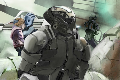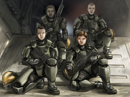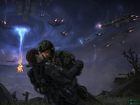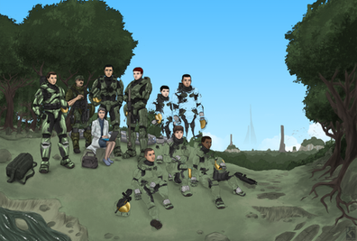 Now for one of the most bizarre scenes in all of Halo fiction, ie that one time Fred-104 got body-surfed. This is one of those pieces that'll probably only make sense to those of you who've read Last Light.Artistically, there's some new things I did here, like the extreme perspective; a lot of my pieces are just neutral flat shots and I really tried to get the "camera" into the middle of the action here.