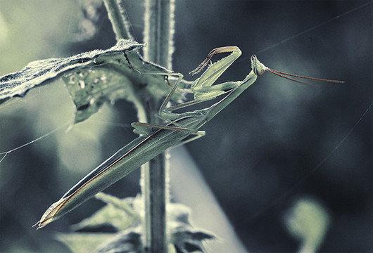 This has gotta be one of my favourite photos. I love the greenish-blue tone. It makes the whole photo have this apocalyptic type atmosphere. The clouds add to this. The mantis itself is just beautiful. I love the detail and how sharp it is. The leaves at the front are essential to this photo's artistic worth. The way they go in and out of focus is brilliant, something I value in photographs. Stunning work. Definitely a favourite.
