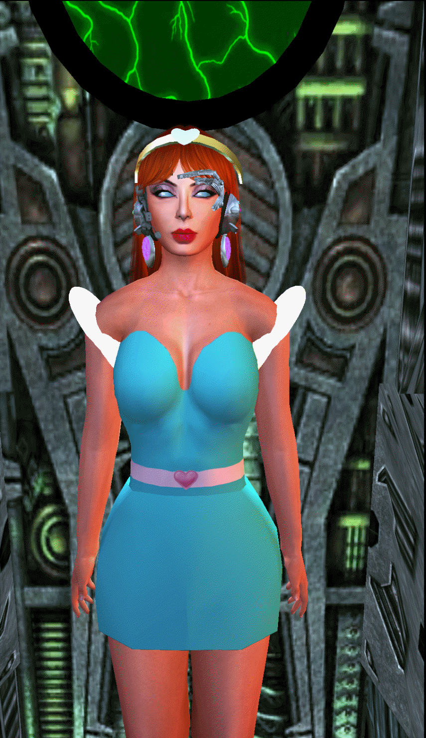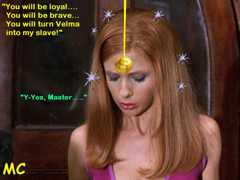 Okay. How about a red haired girl in a long purple dress hypnotized with swirling black eyes?