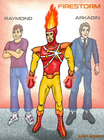 I wanted to show the forming of Firestorm. For those who don't know when Firestorm was first introduced to DC Comics, it was revealed he was 2 people in 1 body. Professor Martin Stein, and High School student Ronnie Raymond were caught in a nuclear explosion and became Firestorm.This art is kind of like how Firestorm was introduced in the Super Friends cartoon episode "The Bride Of Darkseid" when Ronnie & Prof. Stein form the Firestorm matrix. Since I used MS paint to make the effects I admit it's not my best work, but I was drawing a blank on hoew to make the 2 men look like they were becoming Firestorm.