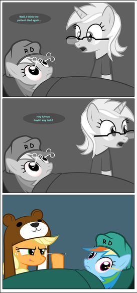 I just don't get why Derpy couldn't have dyed her own mane like Rainbow's... I mean, similar style, same length. Plus, Derpy is far too kind to shave Rainbow Dash's mane off. I know based off of that Slice of Life stuff that she wouldn't do that and she's not as dumb as portrayed either. She's just a shy, clumsy delivery mare.