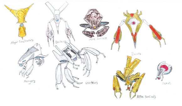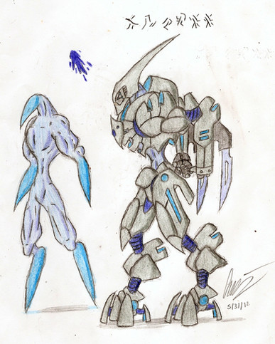 CURSE YOU !!!!!! lol. My good freind really loves Sentinels from Halo, so a while back a started drawing a few Sent pics. I forgot however, when I get interested in something, my brain obsesses over it untill I know everthing about it. So here for a while I have been designing Sentinels out the wazoo! I know right now for no appearent reason is laughing her rear end off! lol.Okay, so here's a little something about the Reapers. They are designed to combat extreme Flood breakouts and destroy Rampant Monitors, Sentinels, ext. They also serve as the elite task force of the Sentinel world. They often are assinged to Elite Sentinels (Like Lazarus-105 [link] ) as elite troops to command. They are armed with a powerful energy sheild on their right forearm and an extending energy blade on their ledt arm along with high powered Sentinel beams and those red things Enforcers fire at close fange. They are equipted with a faster and stronger propultion system that masks their heat signitures making them nearly invisible to all sensors. The strange "feelers" on the top of their heads act as communications systems, a way to interrupt enemy transmissions, and can sense enemies from over two hundred meters away.
