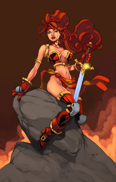 I like how you did the textures on her sword. Nice color choice, too. Very faint burgundy color. Looks nice, as always.