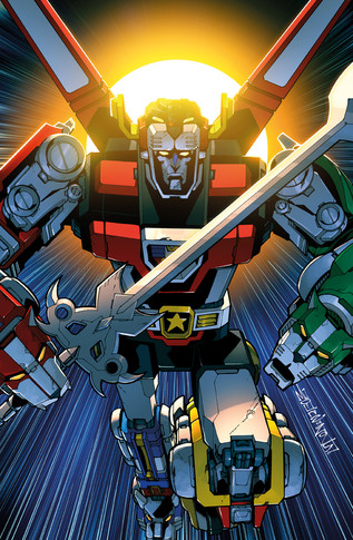 Voltron's glowing eyes and mouth reallymake me think of someone from one of IDW TransFormer's remake comics. Something in the expression reminds me of a bot that's spark is about to blow. I think that's what I like about this, besides the wonderful line art, and the great attention to colour and detail.Β