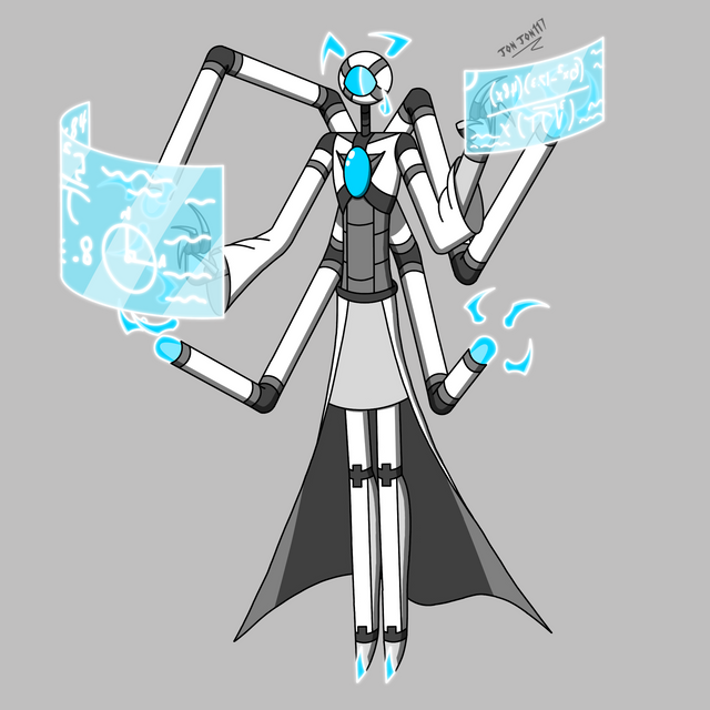 Red is a robot from a huge island in the middle of nowhere. It is way more advanced than the rest of the world. The people there mostly don't interact with the rest of the world, but they do keep tabs on them. When they see the havoc Moros (character from original pic) is wrecking they decide to send out a highly advanced assassin robot to kill him. Red meets the other characters and joins them, and ends up developing self awareness and becomes friends with them.