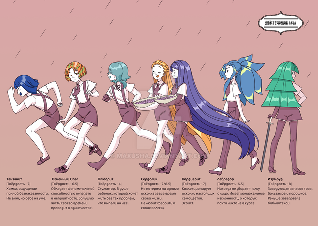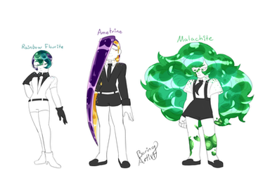 Ianthinite (3): The most forgotten of the Gems. They're incredibly shy and anxious (mainly due to their low hardness). They're an archiver, and keep watch over the storage of items found by others (mainly Pitchblende). Their friends are mainly cockroaches. They were once locked in the storage underground for three weeks until someone realized they were missing.