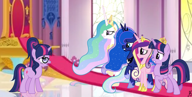 This is kind of what I was thinking when Alicorn Twilight was first thought of. Twilight becomes a princess, she moves back to Canterlot and does her royal duties but Twilight instead chooses her friends over royal duties; something I think is gonna happen in the Season 4 premiere