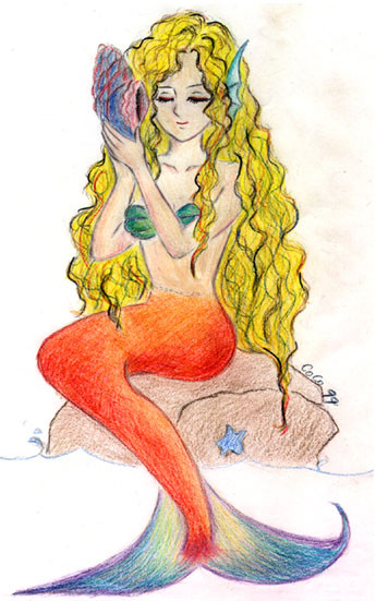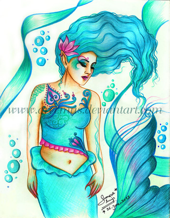 Colored pencil drawing I did of my mermaid lineart.Photo taken with my iPhone, as I am currently without a scanner...this photo does it no justice!