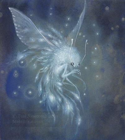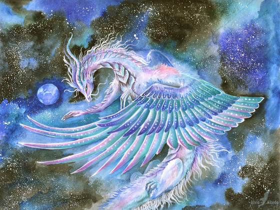 I started by splashing watercolors and isopropyl alcohol onto wet stonehenge paper, and building off from the organic shapes with more watercolor, white and blue acryla-gouache, a little colored pencil and graphite, and white gel pen. The large creature in the middle is accented with pearlescent paint.
