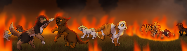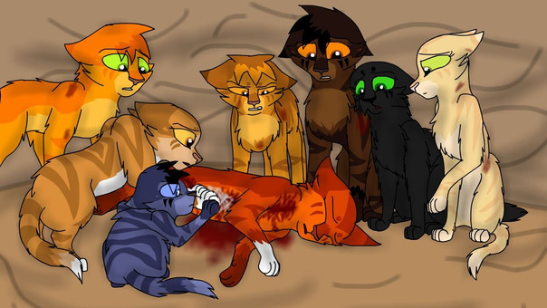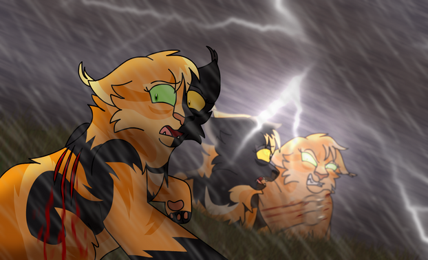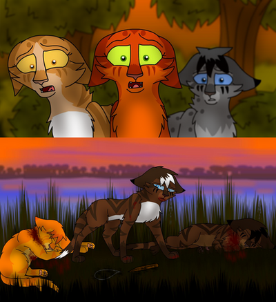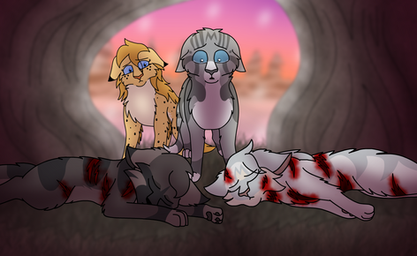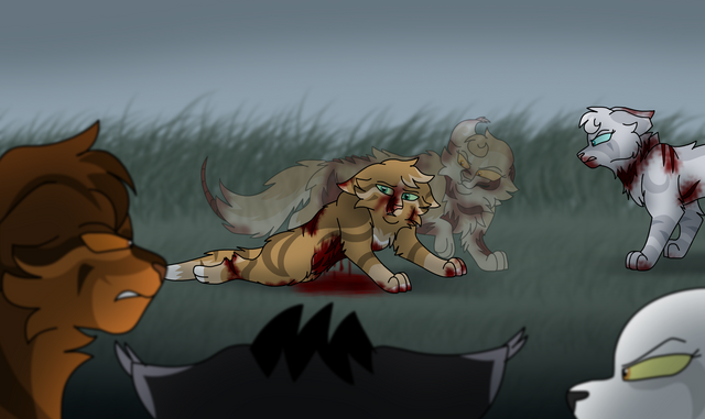 Shot from my Gray Wing and Clear Sky Bad Trip PMV: www.youtube.com/watch?v=tQCEP0…Clear Sky watches as Thunder, Lightning Tail, and Acorn Fur grieve for Hawk Swoop