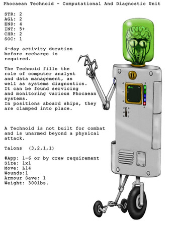 I had some half-dozen different ideas for this, but this is the one that i liked the most.Technically, since the Phocaean brains are encased in a preserving fluid, they are in fact a "dead" race. As their mechanical bodies can't feel pain in any sense, they are treated as zombies in that they suffer no action interruptions or loss from being damaged in combat (main rule book, page 96, under "Wounds"). On balance, if the unit stops working for any reason, the brain case fluid loses its charge and it dies.