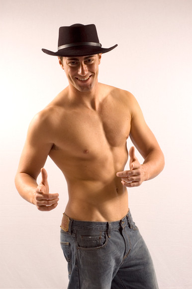 Nice contrast between black clothing and white backdrop, good lighting of skin tones, and nice posture, not too tense, but still energetic. His polite doff of the hat is perfect. Next time, no briefs, but the jacket and hat work nicely (just kidding XD).