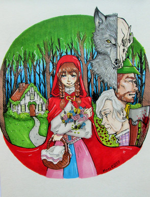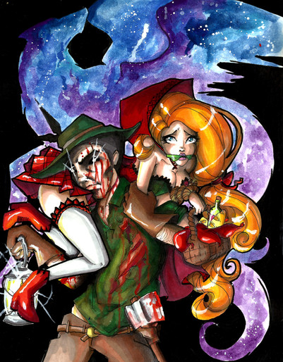 I was trying to create pieces for an upcoming horror convention and my brain kept mostly spitting out dark fairy tales. I drew Red and the page looked empty and unbalanced, so I paired her with the Woodcutter.Original done in copic marker and watercolour.