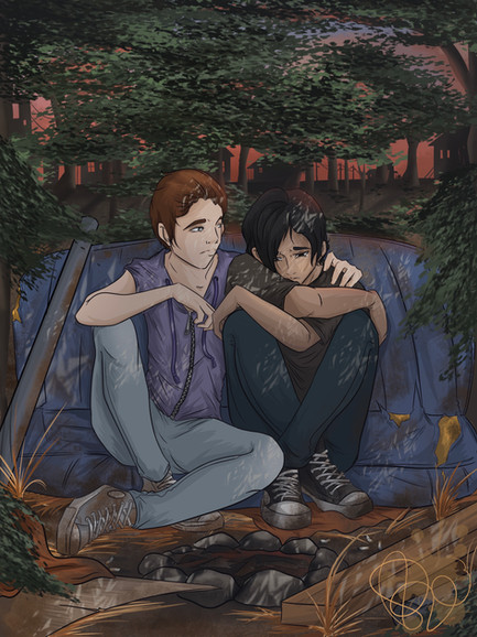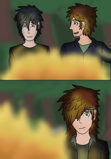 Tac rest his chin in the palm of his hand as he watched the taller man kicking dirt up onto the smoldering coals. He stopped finally, panting as he stared down at the mess he’d made before looking sheepishly back to Tac. Tac gurgled, and Ryan went and retrieved the pan, coming back to sit next to the younger boy, dropping what was left of erm… something in front of them.